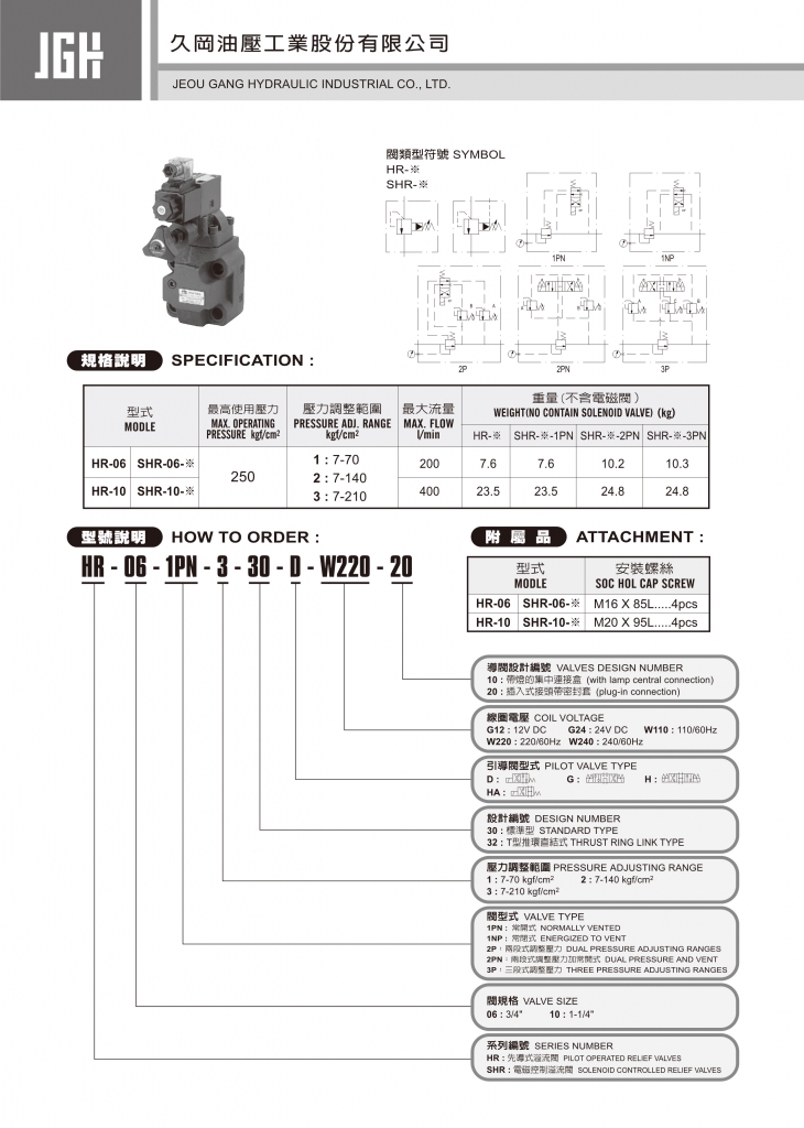 JGH先導(dǎo)式溢流閥、電磁控制溢流閥常規(guī)型號(hào)參考:HR-06-1NP-1 , HR-06-1NP-2 , HR-06-1NP-3 , HR-06-1PN-1 , HR-06-1PN-2 , HR-06-1PN-3 , HR-10-1NP-1 , HR-10-1NP-2 , HR-10-1NP-3 , HR-10-1PN-1 , HR-10-1PN-2 , HR-10-1PN-3 , SHR-06-1NP-1 , SHR-06-1NP-2 , SHR-06-1NP-3 , SHR-06-1PN-1 , SHR-06-1PN-2 , SHR-06-1PN-3 , SHR-10-1NP-1 , SHR-10-1NP-2 , SHR-10-1NP-3 , SHR-10-1PN-1 , SHR-10-1PN-2 , SHR-10-1PN-3