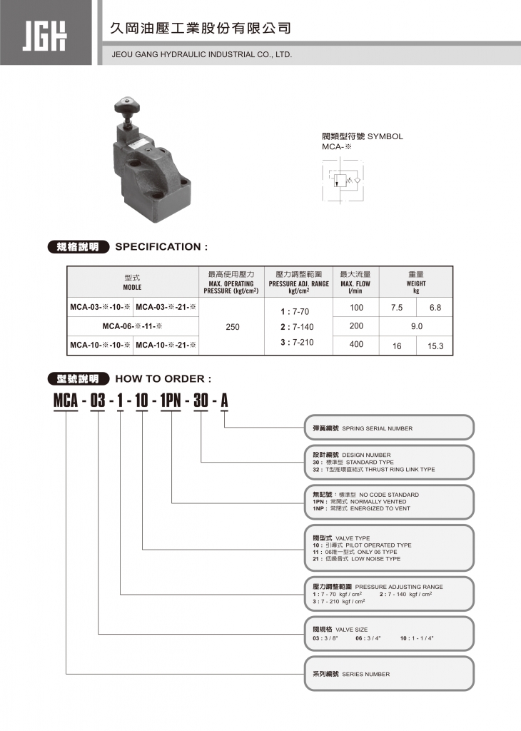 規(guī)格說明 型式 最高使用壓力 kgf/cm?2 壓力調(diào)整範(fàn)圍 kgf/cm?2 最大流量 l/min 重量 kg MCA-03-※-10-※ MCA-03-※-21-※ 250 1 :?7-70 2 :?7-140 3 :?7-210 100 7.5 6.8 MCA-06-※-11-※ 200 9.0 MCA-10-※-10-※ MCA-10-※-21-※ 400 16 15.3 JGH背壓閥常規(guī)