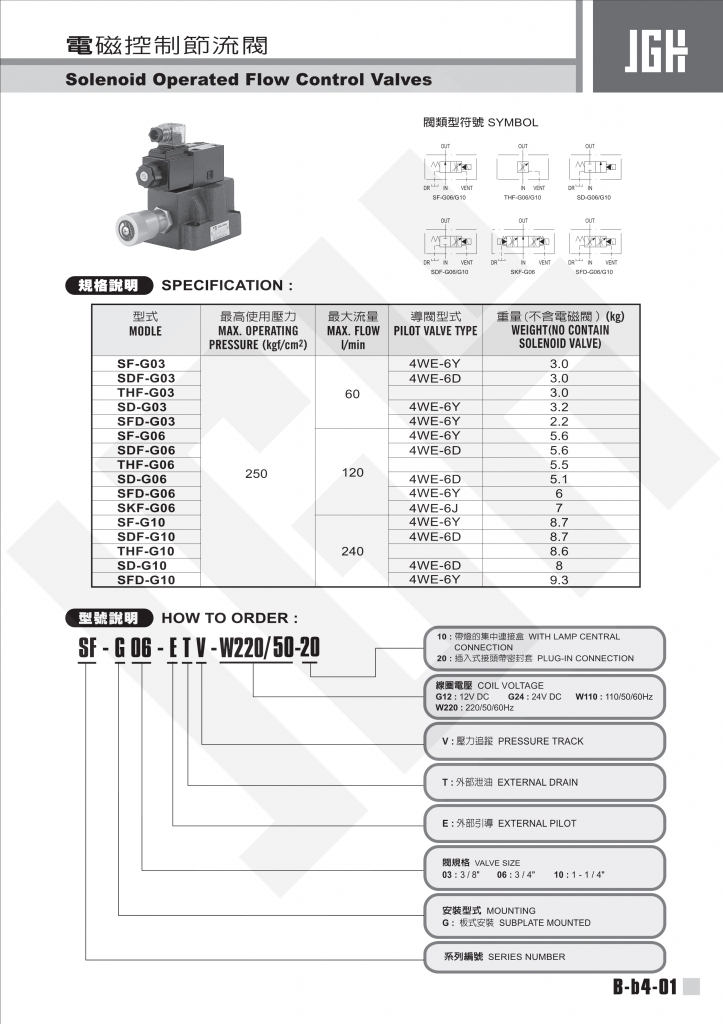 JGH電磁控制節(jié)流閥常規(guī)型號(hào)參考:SDF-G03-ETV , SDF-G06-ETV , SDF-G10-ETV , SD-G03-ETV , SD-G06-ETV , SD-G10-ETV , SFD-G03-ETV , SFD-G06-ETV , SFD-G10-ETV , SF-G03-ETV , SF-G06-ETV , SF-G10-ETV , SKF-G06-ETV , THF-G03-ETV , THF-G06-ETV , THF-G10-ETV