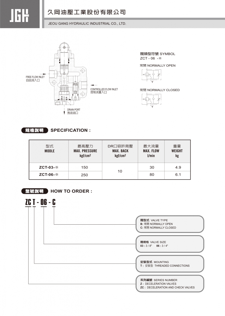 JGH機(jī)械式節(jié)流閥常規(guī)型號(hào)參考:ZCT-03-B , ZCT-03-C , ZCT-06-B , ZCT-06-C