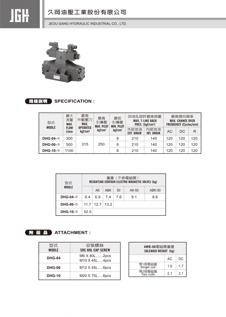 規(guī)格說明 型式 最大流量 l/min 最高作動(dòng)壓力 kgf/cm2 最高引導(dǎo)壓 kgf/cm2 最低引導(dǎo)壓 kgf/cm2 回油孔容許最高背壓 (kgf/cm2) 最高換回頻率 (Cycles/min) 外部泄油 內(nèi)部泄油 AC DC R DHG-04-※ 300 315 250 8 210 140 120 120 120 DHG-06-※ 500 8 210 140 120 120 120 DH