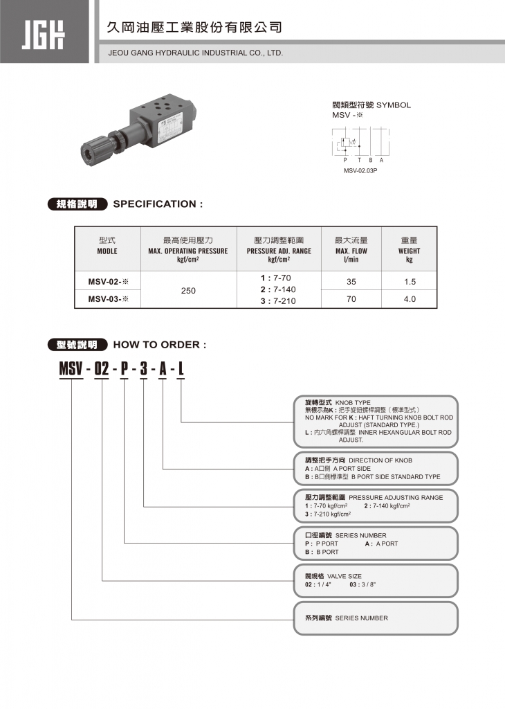 JGH久岡疊加式控制閥部分常規(guī)型號(hào)參考:MSV-02-A-1-A , MSV-02-A-1-B , MSV-02-A-2-A , MSV-02-A-2-B , MSV-02-A-3-A , MSV-02-A-3-B , MSV-02-B-1-A , MSV-02-B-1-B , MSV-02-B-2-A , MSV-02-B-2-B , MSV-02-B-3-A , MSV-02-B-3-B , MSV-02-P-1-A , MSV-02-P-1-B , MSV-02-P-2-A , MSV-02-P-2-B , MSV-02-P-3-A , MSV-02-P-3-B , MSV-03-A-1-A , MSV-03-A-1-B , MSV-03-A-2-A , MSV-03-A-2-B , MSV-03-A-3-A , MSV-03-A-3-B , MSV-03-B-1-A , MSV-03-B-1-B , MSV-03-B-2-A , MSV-03-B-2-B , MSV-03-B-3-A , MSV-03-B-3-B , MSV-03-P-1-A , MSV-03-P-1-B , MSV-03-P-2-A , MSV-03-P-2-B , MSV-03-P-3-A , MSV-03-P-3-B