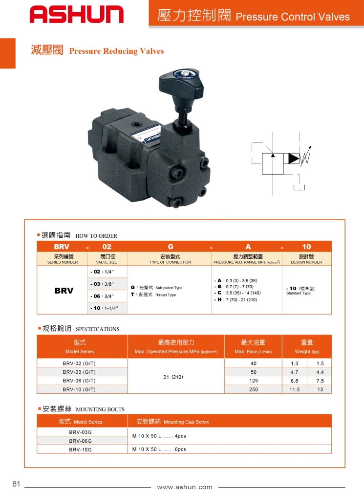 ASHUN油順壓力控制閥 BRV系列減壓閥