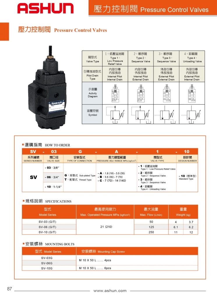 ASHUN壓力控制閥常規(guī)型號參考:SV-03G-A-1-10 , SV-03G-A-2-10 , SV-03G-A-3-10 , SV-03G-A-4-10 , SV-03G-B-1-10 , SV-03G-B-2-10 , SV-03G-B-3-10 , SV-03G-B-4-10 , SV-03G-C-1-10 , SV-03G-C-2-10 , SV-03G-C-3-10 , SV-03G-C-4-10 , SV-03T-A-1-10 , SV-03T-A-2-10 , SV-03T-A-3-10 , SV-03T-A-4-10 , SV-03T-B-1-10 , SV-03T-B-2-10 , SV-03T-B-3-10 , SV-03T-B-4-10 , SV-03T-C-1-10 , SV-03T-C-2-10 , SV-03T-C-3-10 , SV-03T-C-4-10 , SV-06G-A-1-10 , SV-06G-A-2-10 , SV-06G-A-3-10 , SV-06G-A-4-10 , SV-06G-B-1-10 , SV-06G-B-2-10 , SV-06G-B-3-10 , SV-06G-B-4-10 , SV-06G-C-1-10 , SV-06G-C-2-10 , SV-06G-C-3-10 , SV-06G-C-4-10 , SV-06T-A-1-10 , SV-06T-A-2-10 , SV-06T-A-3-10 , SV-06T-A-4-10 , SV-06T-B-1-10 , SV-06T-B-2-10 , SV-06T-B-3-10 , SV-06T-B-4-10 , SV-06T-C-1-10 , SV-06T-C-2-10 , SV-06T-C-3-10 , SV-06T-C-4-10 , SV-10G-A-1-10 , SV-10G-A-2-10 , SV-10G-A-3-10 , SV-10G-A-4-10 , SV-10G-B-1-10 , SV-10G-B-2-10 , SV-10G-B-3-10 , SV-10G-B-4-10 , SV-10G-C-1-10 , SV-10G-C-2-10 , SV-10G-C-3-10 , SV-10G-C-4-10 , SV-10T-A-1-10 , SV-10T-A-2-10 , SV-10T-A-3-10 , SV-10T-A-4-10 , SV-10T-B-1-10 , SV-10T-B-2-10 , SV-10T-B-3-10 , SV-10T-B-4-10 , SV-10T-C-1-10 , SV-10T-C-2-10 , SV-10T-C-3-10 , SV-10T-C-4-10