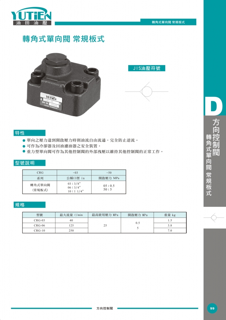 YUTIEN油田方向控制閥 CRG系列轉(zhuǎn)角式單向閥 常規(guī)板式