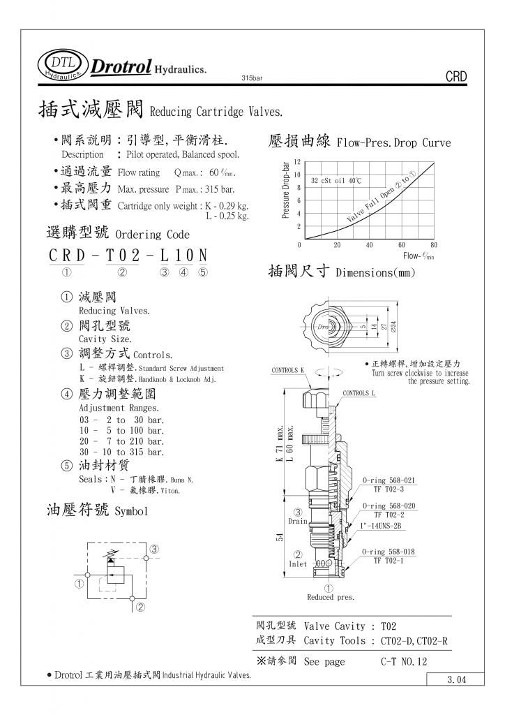 DTL插式減壓閥部分常規(guī)型號參考:CRD-063-K03N , CRD-063-K03V , CRD-063-K10N , CRD-063-K10V , CRD-063-K20N , CRD-063-K20V , CRD-063-L03N , CRD-063-L03V , CRD-063-L10N , CRD-063-L10V , CRD-063-L20N , CRD-063-L20V ,