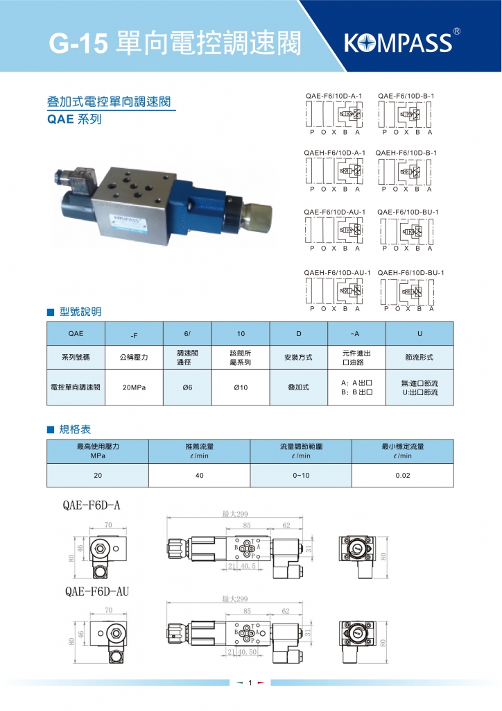 KOMPASS疊加式電控單向調速閥部分常規(guī)型號參考:QAE-F6/10D-A , QAE-F6/10D-AU , QAE-F6/10D-B , QAE-F6/10D-BU