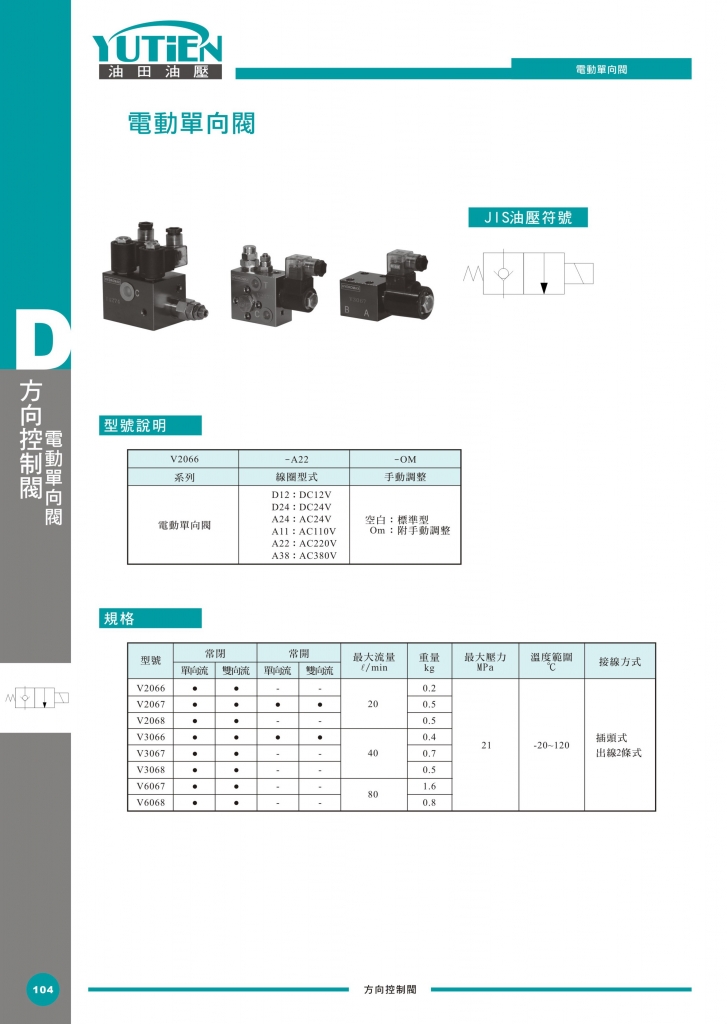 YUTIEN電動單向閥部分常規(guī)型號參考:V2066-A11 , V2066-A11-OM , V2066-A22 , V2066-A22-OM , V2066-A24 , V2066-A24-OM , V2066-A38 , V2066-A38-OM , V2066-D12 , V2066-D12-OM , V2066-D24 , V2066-D24-OM , V2067-A11 , V2067-A11-OM , V2067-A22 , V2067-A22-OM , V2067-A24 , V2067-A24-OM , V2067-A38 , V2067-A38-OM , V2067-D12 , V2067-D12-OM , V2067-D24 , V2067-D24-OM , V2068-A11 , V2068-A11-OM , V2068-A22 , V2068-A22-OM , V2068-A24 , V2068-A24-OM , V2068-A38 , V2068-A38-OM , V2068-D12 , V2068-D12-OM , V2068-D24 , V2068-D24-OM , V3066-A11 , V3066-A11-OM , V3066-A22 , V3066-A22-OM , V3066-A24 , V3066-A24-OM , V3066-A38 , V3066-A38-OM , V3066-D12 , V3066-D12-OM , V3066-D24 , V3066-D24-OM , V3067-A11 , V3067-A11-OM , V3067-A22 , V3067-A22-OM , V3067-A24 , V3067-A24-OM , V3067-A38 , V3067-A38-OM , V3067-D12 , V3067-D12-OM , V3067-D24 , V3067-D24-OM , V3068-A11 , V3068-A11-OM , V3068-A22 , V3068-A22-OM , V3068-A24 , V3068-A24-OM , V3068-A38 , V3068-A38-OM , V3068-D12 , V3068-D12-OM , V3068-D24 , V3068-D24-OM , V6067-A11 , V6067-A11-OM , V6067-A22 , V6067-A22-OM , V6067-A24 , V6067-A24-OM , V6067-A38 , V6067-A38-OM , V6067-D12 , V6067-D12-OM , V6067-D24 , V6067-D24-OM , V6068-A11 , V6068-A11-OM , V6068-A22 , V6068-A22-OM , V6068-A24 , V6068-A24-OM , V6068-A38 , V6068-A38-OM , V6068-D12 , V6068-D12-OM , V6068-D24 , V6068-D24-OM