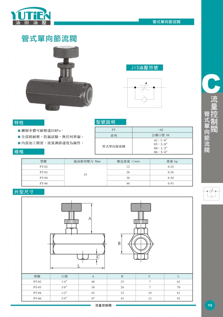 YUTIEN管式單向節(jié)流閥部分常規(guī)型號參考:PT-02 , PT-03 , PT-04 , PT-06