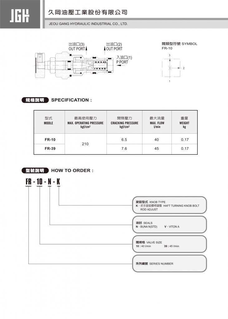 規(guī)格說明 型式 最高使用壓力 kgf / cm2 開啟壓力 kgf / cm2 最大流量 l/min 重量 kg FR-10 210 6.5 40 0.17 FR-39 7.6 45 0.17