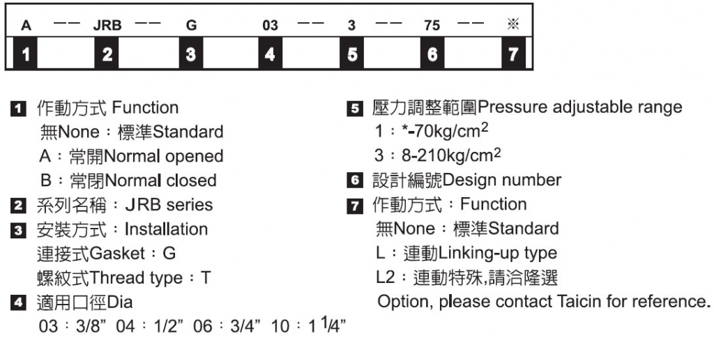 型式號碼 最大壓力 (KG/CM2) 適用管徑 (PT) 最大流量 (LPM)